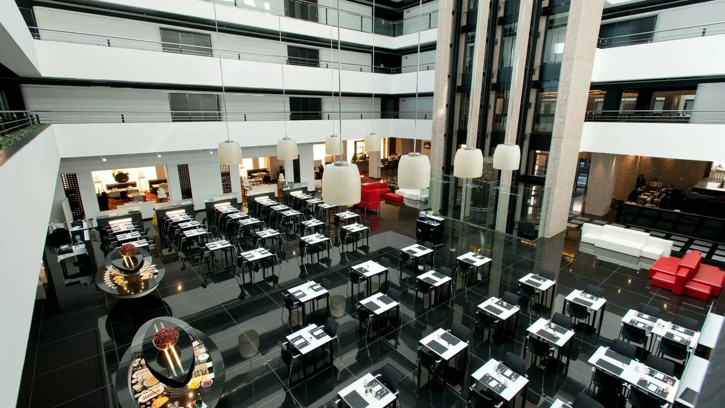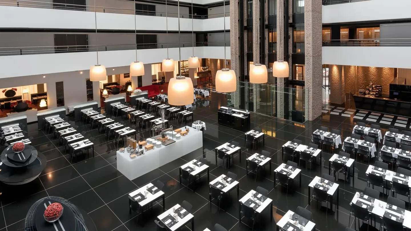 Las opciones de catering cubren desde coffee-breaks, almuerzos ejecutivos hasta cenas de gala, con menús personalizados que pueden incorporar elementos de identidad corporativa o experiencias gastronómicas a medida. Complementariamente, las instalaciones del hotel —con 284 habitaciones en el mismo edificio, zonas comunes modernas, piscina cubierta y exterior, gimnasio, servicios de transporte al aeropuerto— favorecen el alojamiento integrado para delegados y ponentes, así como la combinación de trabajo y descanso. A ello se suma que el hotel está adaptado para grupos y dispone de certificaciones de sostenibilidad, lo que refuerza su atractivo para organizaciones que buscan un entorno profesional y responsable.