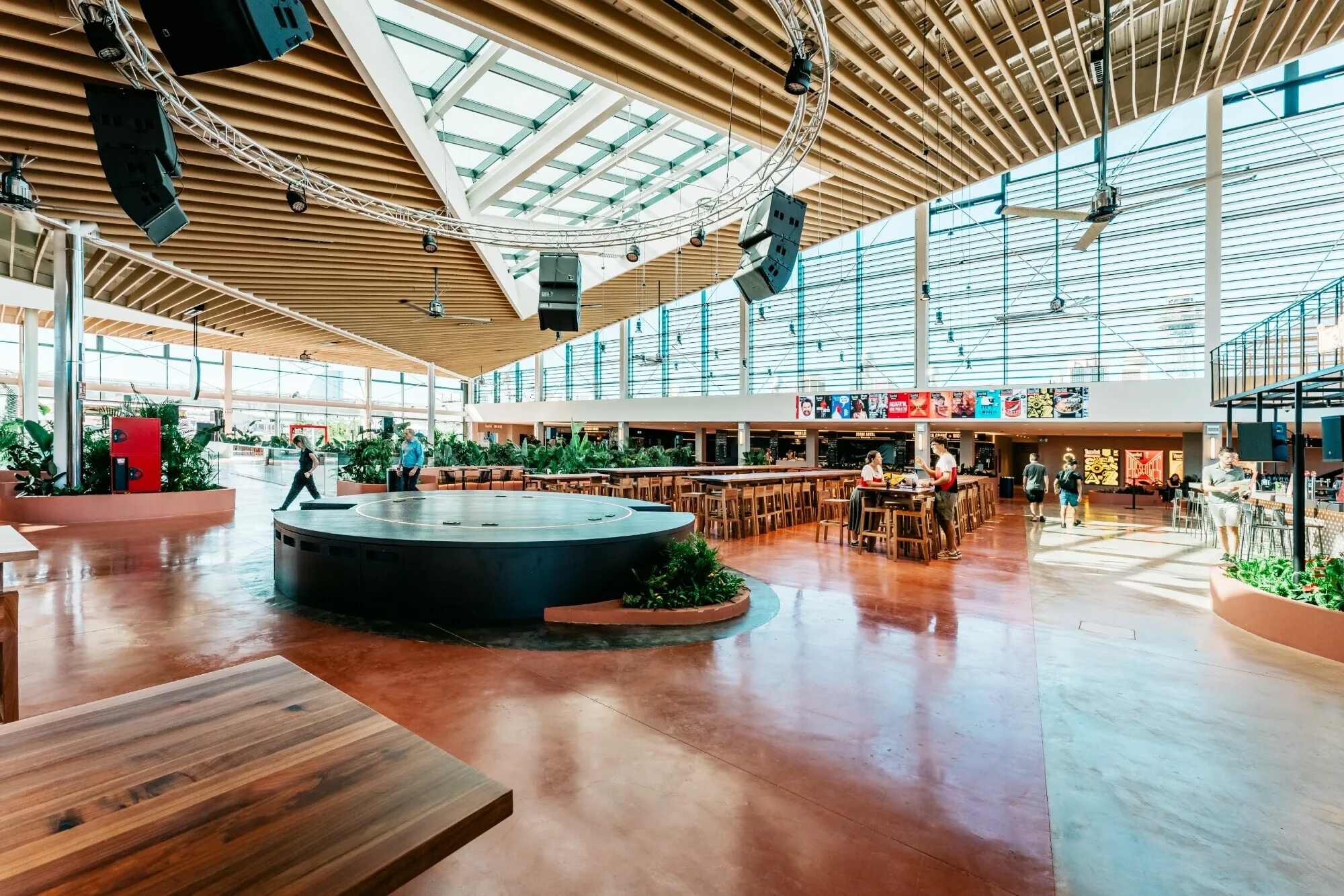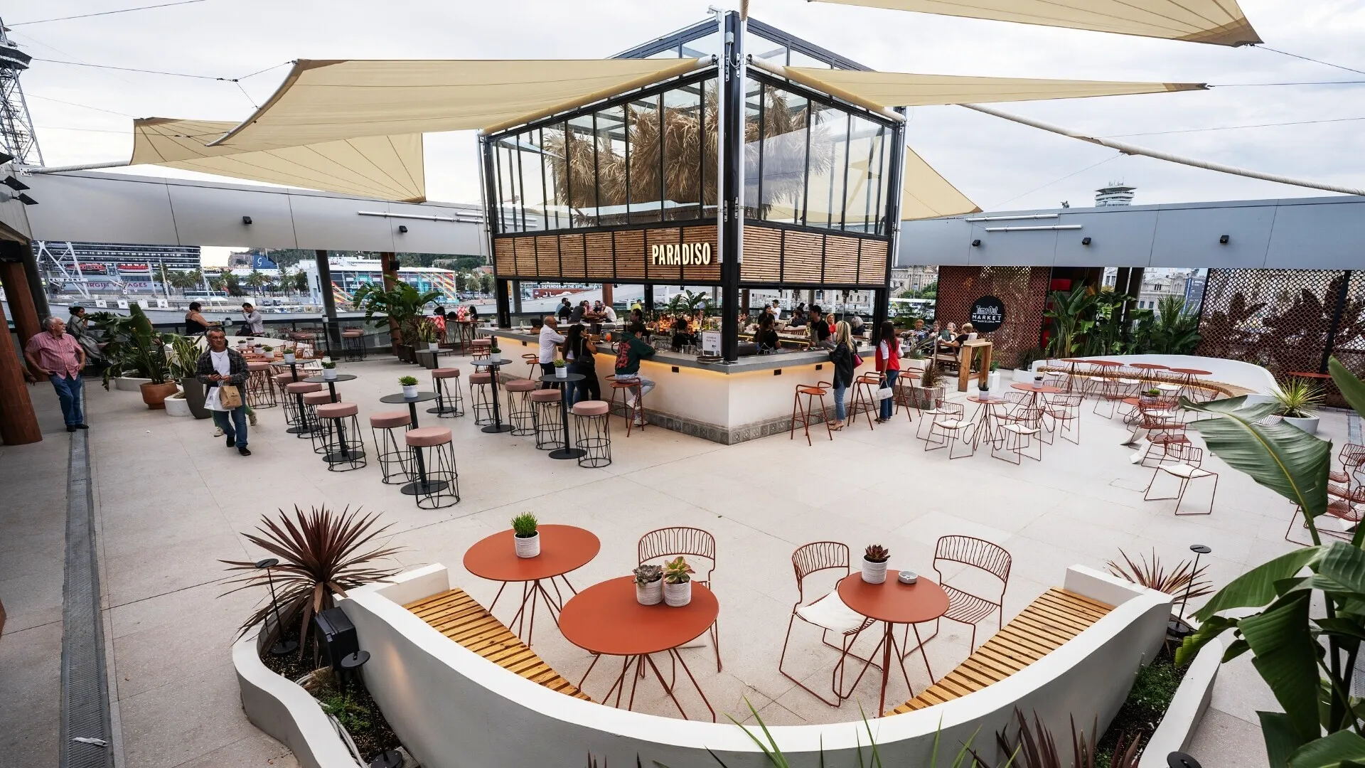 Estratégicamente ubicado en la animada zona del Port Vell, Time Out Market Barcelona ocupa la última planta del reconocido centro comercial Maremagnum. Esta ubicación privilegiada no solo ofrece impresionantes vistas panorámicas del puerto deportivo y el mar Mediterráneo, sino que también garantiza un fácil acceso para todos. Los visitantes pueden llegar al mercado sin esfuerzo gracias a una conexión directa desde la calle, accesible mediante una práctica escalera mecánica y un ascensor. Esta estratégica ubicación lo convierte en un destino ideal tanto para comensales ocasionales como para quienes buscan una experiencia gastronómica más inmersiva.